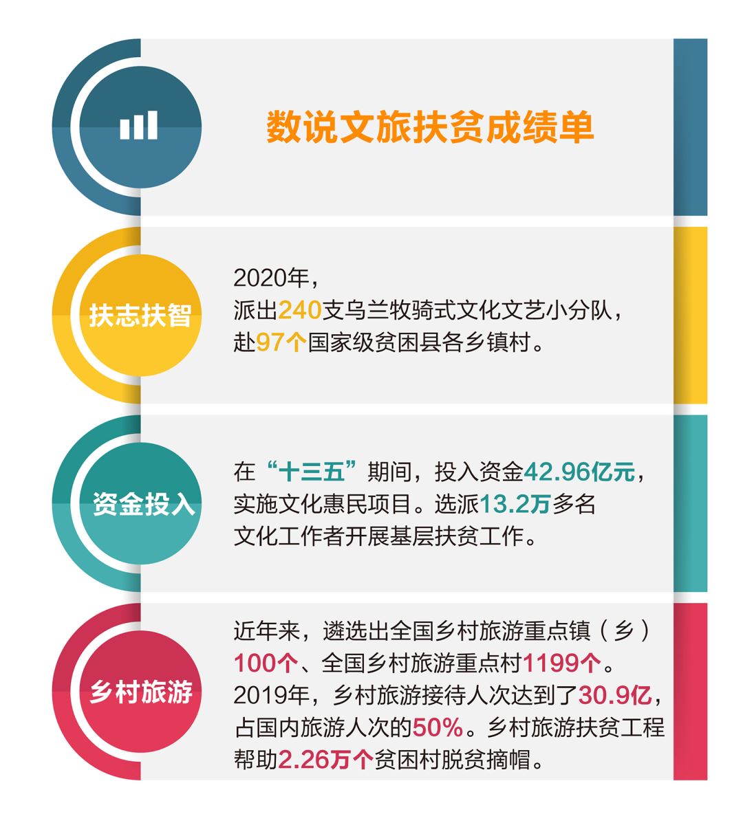 据了解,2020年,文化和旅游部直属的10家文艺院团,以国家级贫困县特别是14个集中连片特困区内的深度贫困县为重点,共派出了240支乌兰牧骑式的文化文艺小分队,分赴97个国家级贫困县各乡镇村开展慰问演出、文艺辅导、展览讲座等多项活动。据统计,各省(区、市)一共组织了近2万支文化文艺小分队,走到人民中去,向人民学习,为人民服务,通过“菜单式”的内容提供和“订单式”的对接服务,开展了丰富多彩的文化艺术活动,激发起了干部群众决胜全面小康的雄心和信心。