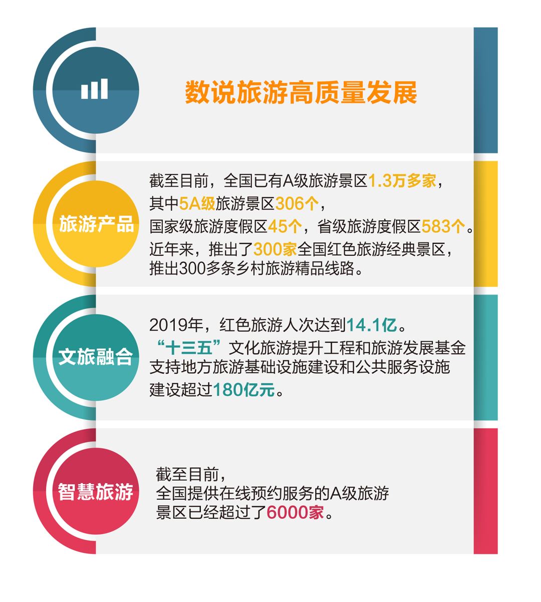 如今,旅游业正由单一观光型向观光和度假休闲并重的复合型转变。据文化和旅游部资源开发司司长单钢新介绍,文化和旅游部以市场需求为导向,以品牌建设为抓手,积极推动旅游景区挖掘文化内涵,通过提质扩容推动转型升级。同时,也引导各地积极建设旅游度假区,丰富休闲度假产品体系,使传统的观光旅游与休闲度假齐头并进。截至目前,全国已有A级旅游景区1.3万多家,其中5A级旅游景区306个;国家级旅游度假区45个,省级旅游度假区583个。