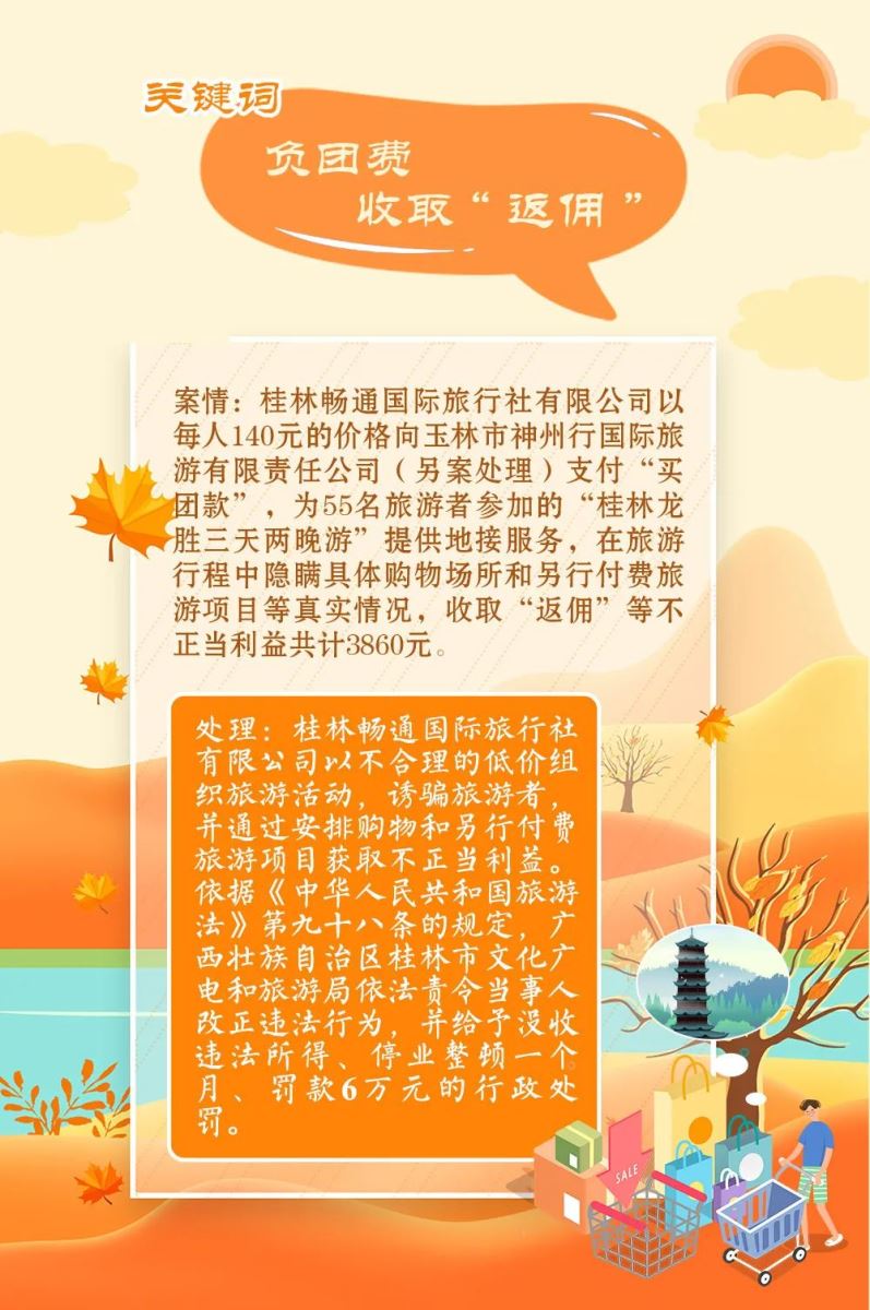 为进一步加强社会监督,规范旅游市场经营秩序,文化和旅游部公布了专项整治行动第四批指导案例,包括以康养活动招徕旅游者、购物送旅游、网络招徕、旅拍、“不合理低价游”的执法案例。国庆节将至,文化和旅游部提示广大旅游者审慎甄别旅游产品,理性选择合法正规的旅游服务,自觉抵制“不合理低价游”,保障自身安全和合法权益。欢迎社会公众通过举报电话12318和举报平台jbts.mct.gov.cn对违法违规旅游市场经营活动进行举报监督。