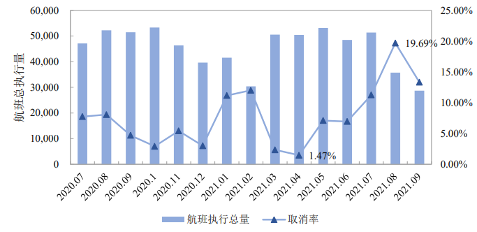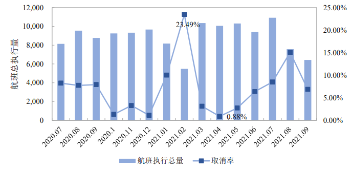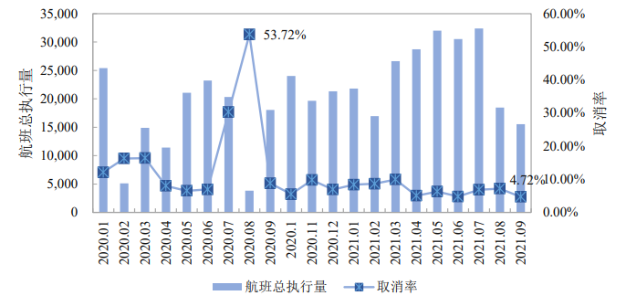 图6 2020-2021年上海市航班执行总量与取消率
