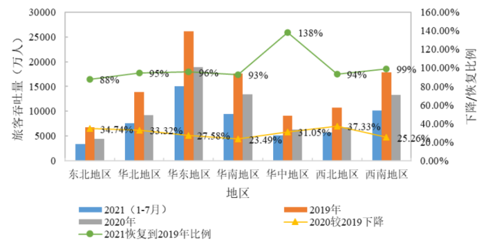 图12 2019和2021年1-7月国内机场旅客吞吐量恢复情况