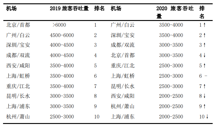 表1 2019和2020年全国各机场旅客吞吐量排名(单位:万人)