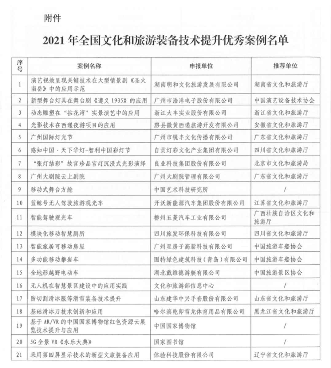 近日,文化和旅游部科技教育司公布2021年全国文化和旅游装备技术提升优秀案例名单。全文如下: