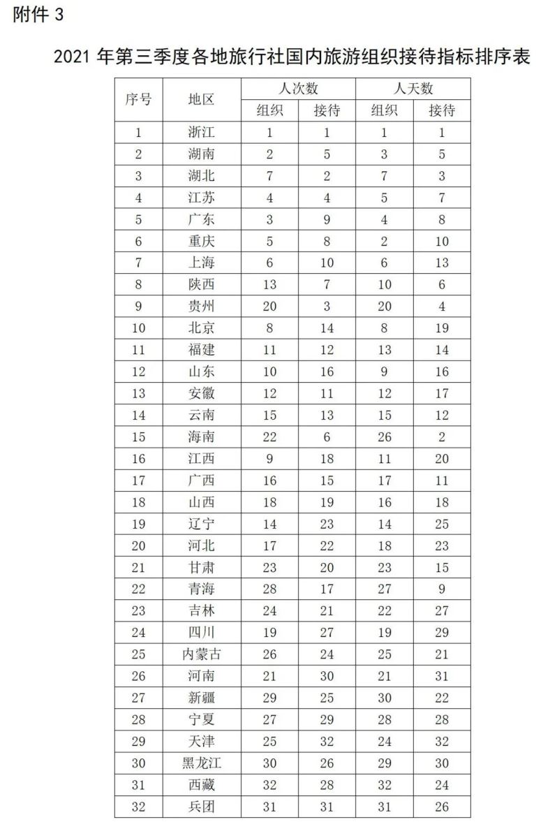 2021年第三季度旅行社国内旅游组织接待人次(人天)汇总排序前十位的地区由高到低依次为浙江、湖南、湖北、江苏、广东、重庆、上海、陕西、贵州、北京(详见附件3)。