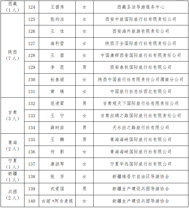 根据《文化和旅游部市场管理司关于实施2021年“金牌导游”培养项目的通知》(市场函〔2021〕40号)要求,经个人申报、组织推荐和公示,确定2021年“金牌导游”培养对象共140人,名单附后。