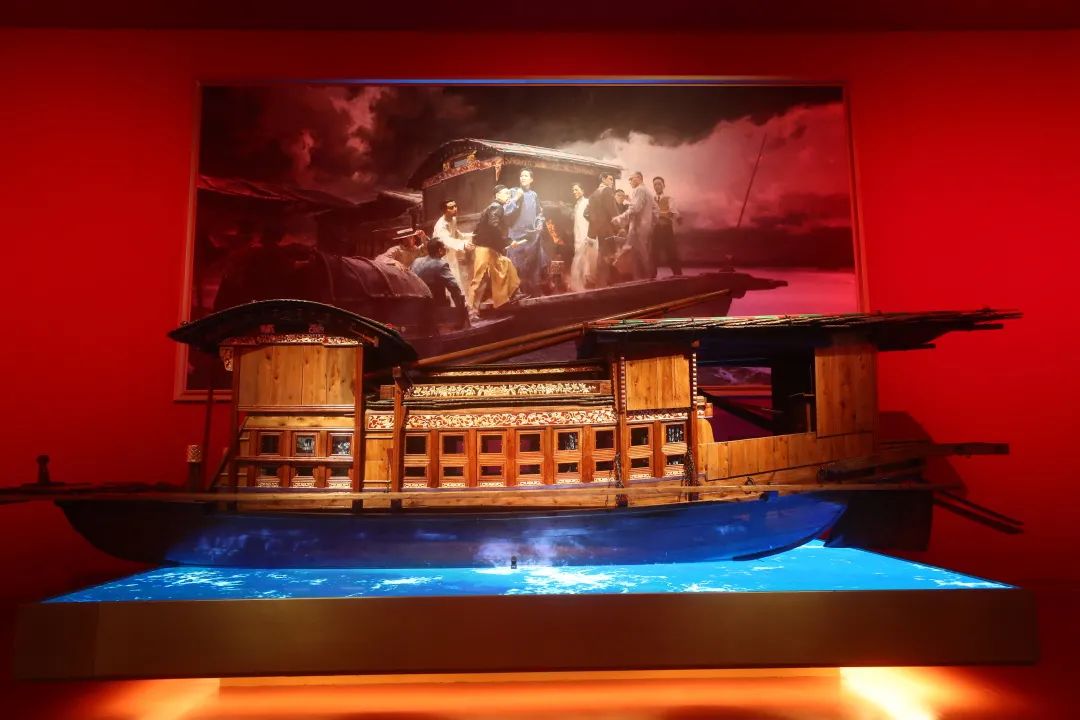 中国共产党历史展览馆中,何红舟、黄发祥创作的油画《启航》与红船模型的展陈布置营造了中共一大在南湖召开的历史瞬间。