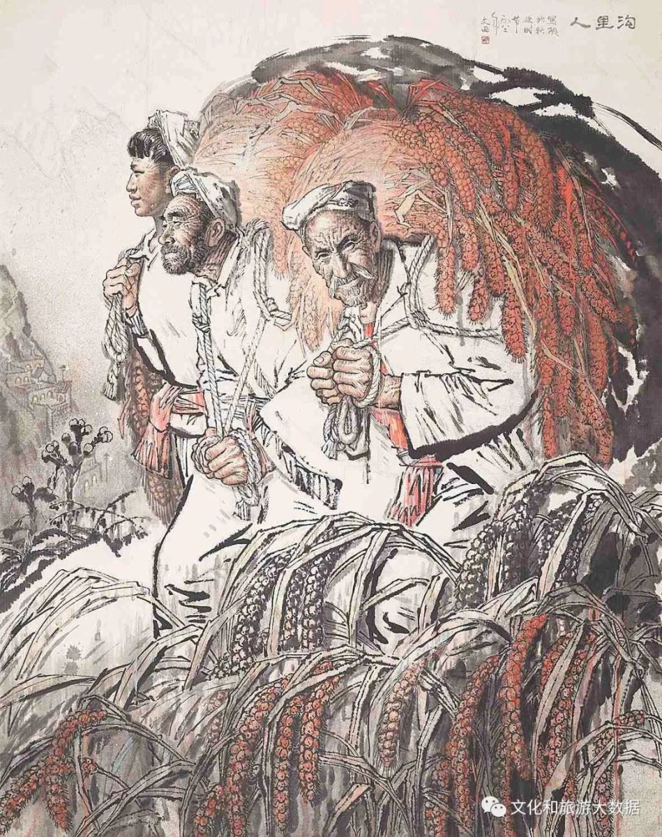 1980年秋,刘文西在延安冯庄写生,此时太阳快要下山,几位老汉迎面走来,背上压着小山一样的谷垛,古铜色的脸上淌着一道道和着泥土的汗水。作品《沟里人》正是描绘了这样三位朴实、平凡的陕北农民,真实地刻画出劳动人民的艰辛与勤劳,反映一代代人在这片黄土地上坚强而积极地生活。