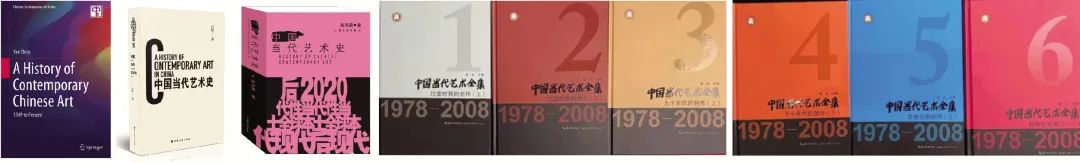 从左到右依次为:周彦著《1949年迄今的当代中国艺术史》、吕澎著《中国当代艺术史》、高名潞著《中国当代艺术史》、鲁虹著《中国当代艺术全集1978-2008》
