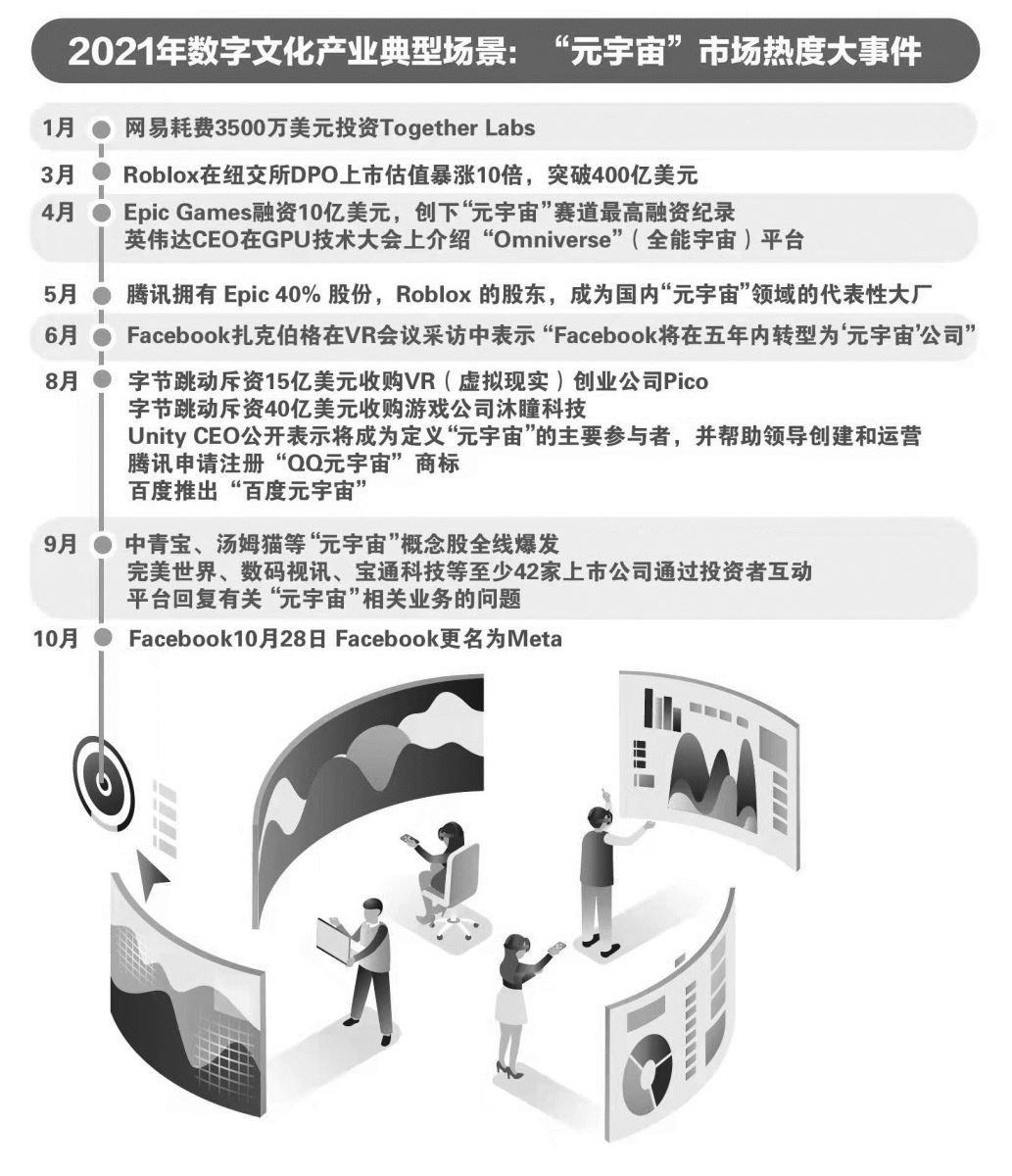 特别是近一段时期以来,基于数字文化产业应用场景的新概念“元宇宙”,成为资本市场关注度极高的领域,其发展和解读进入无边界、无标准、由技术与资本主导驱动的非理性状态。这就需要更加冷静,跳出数字文化产业内部逻辑,从更外部的视角审视数字文化产业发展的趋势、节点,对技术应用、数据边界等关键问题进行梳理,避免出现过度虚拟化、商业化,引导数字技术与文化产业“双效统一”发展。