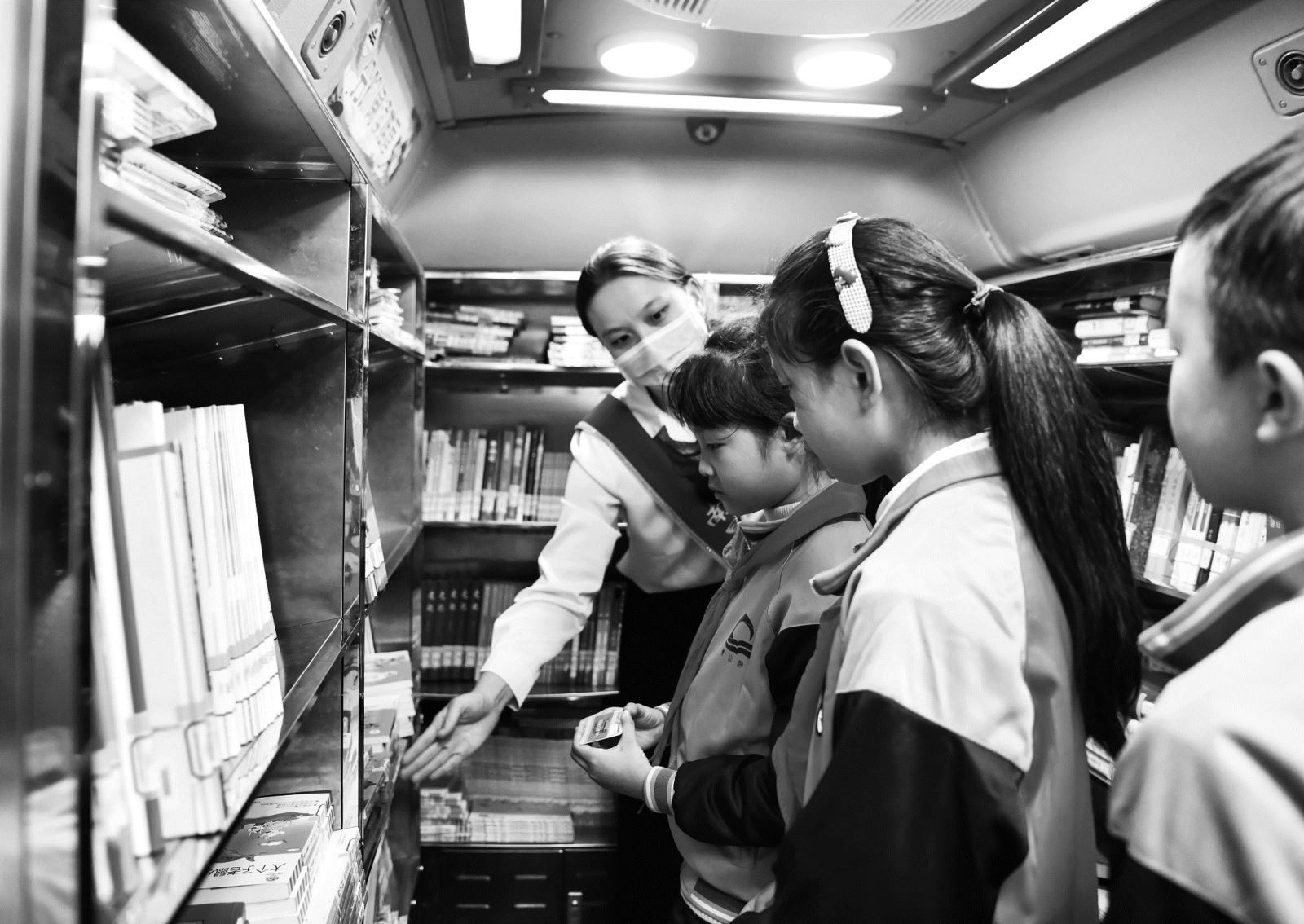 伴随着温暖的春风,孩子们排着队在“图书大篷车”里挑选自己心仪的课外书。走进这辆改装的“图书大篷车”,就像步入一座微型图书馆——车内的书架上整齐地放置着针对各年级学生的课外读物,涉及文学、历史、科幻等各个方面,数量近1500本,并设有文津图书奖专柜、新书快递·好书推荐专柜、分阶阅读推荐专柜。此外,图书自助借还机、科普VR眼镜、电子歌德机、电子阅读本、便携式朗读亭以及电子图书一体机等多媒体电子阅读设备也十分丰富。“我们车上的书都是教育部推荐的‘小学生必读书目’以及品质高、适合学生阅读的课外读物,让学生在课后接触到优质的课外读物,培养他们爱读书、读好书的习惯。”“图书大篷车”的工作人员说。