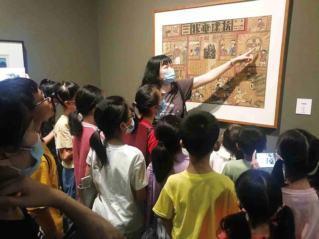 2021年,在“浙江版画百年艺术特展”上,老师给孩子们讲解抗战时期的木刻墙报。