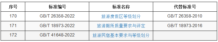 其中,由全国旅游标准化技术委员会归口及执行的标准有GB/T 26358-2022《旅游度假区等级划分》、GB/T 18973-2022《旅游厕所质量要求与评定》、GB/T 41648-2022《旅游民宿基本要求与等级划分》。其中,《旅游度假区等级划分》《旅游厕所质量要求与评定》为原国家标准修订,《旅游民宿基本要求与等级划分》为旅游行业标准升级国家标准。