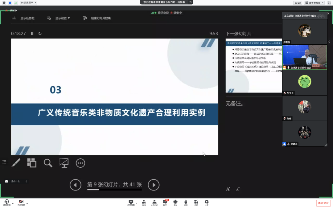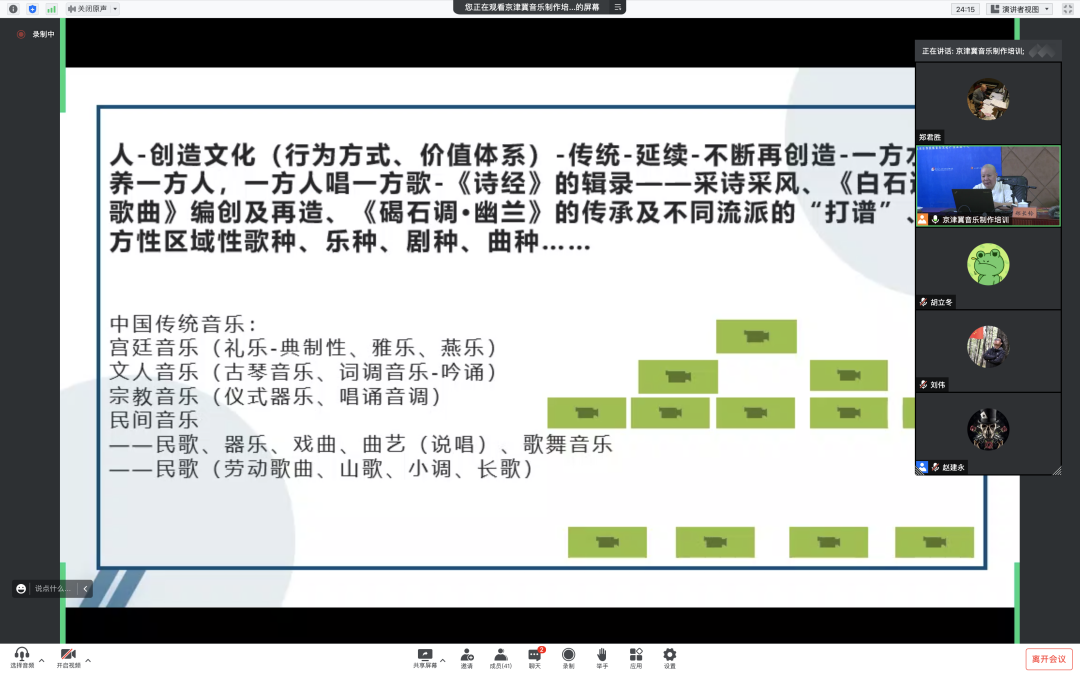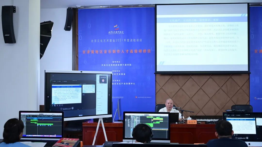 培训组在设计课程的时候,不仅在音乐制作技术专业领域中加强作曲理论、制作实践等方面的专业核心课程,更在传统文化、戏曲、民歌中加强学员的营养汲取,特别是在音乐类的非物质文化遗产传承与发展方面为学员们做了精心的课程设计。郑长铃教授是国内非物质文化遗产保护的著名专家,常年工作在“非遗”第一线,为国内的非物质文化遗产保护工作做了众多贡献,其在音乐类的非物质文化遗产保护工作更是尤为凸显。本课程板块是独具特色的一个板块,从非物质文化遗产传承与发展的角度考察调研民族器乐、民间歌曲、传统戏曲等的创造性转化和创新性发展,从而全面拓展音乐制作的技术空间和创作广度,并将其渗透到创作血液中。为了能够实现优质的学习效果,郑长铃教授花了大量的时间,了解和研究此方面的专业需求。在授课当中,学员们被深深地吸引,并感叹我们国家的传统音乐类“非遗”如此的博大精深。这些“非遗”方面的精华知识正是学员们心中渴望获取的学识,本次讲座满足了学员在此方面的学习诉求,使学员在创作中有了更强的传统文化知识做积淀。