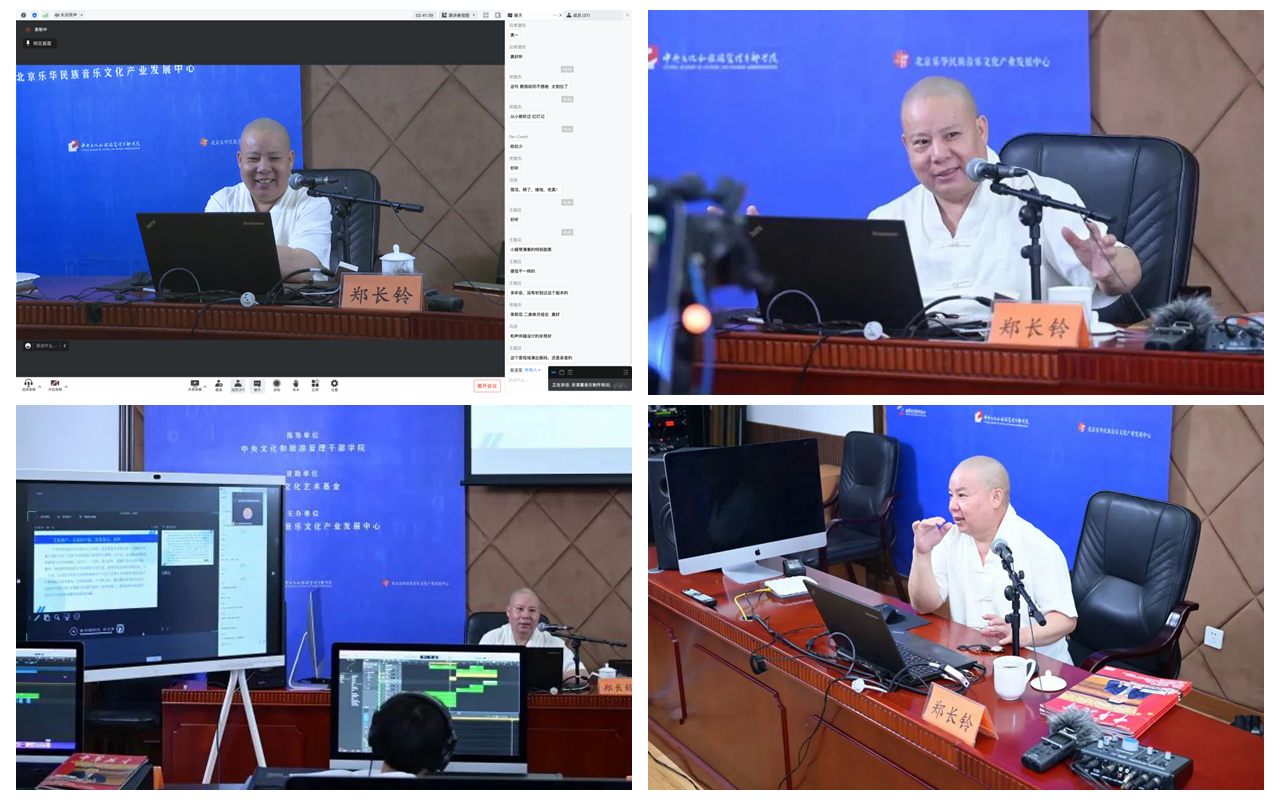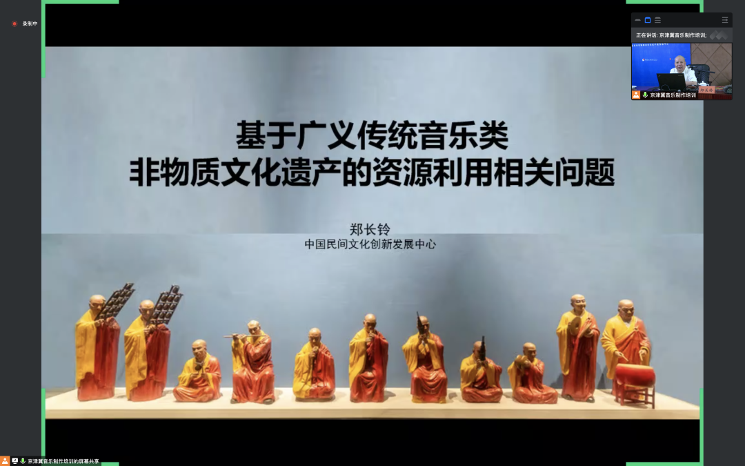 在音乐制作中,离不开传统音乐的营养供给,传统音乐文化是根,现代音乐作品的制作不能是无源之水。要想真正创作出优秀的作品,只有全面深入地了解传统民族民间音乐,并深深扎根于田野,不断地去深入研究学习,才能为专业的音乐制作工作打下坚实的基础,真正做到创作灵感手到擒来,实现美妙的音乐毫无压力。由此可见,传统音乐文化对于现代音乐制作技术所起到的重要作用。为了让学员们在传统音乐文化方面能够有机会进一步深入地了解和研究,培训组专门邀请了中国艺术研究院二级研究员,硕士、博士研究生导师郑长铃老师为学员们带来非常精彩的专题讲座——《基于广义传统音乐类非遗资源利用相关问题》。