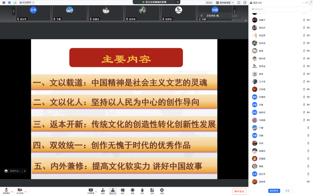 李教授从新时代文艺创作的历史使命出发,在课程中,她为大家从广义的层面来引导大家理解文化,从国家战略的高度去看待文化建设在整个大国崛起当中的重要的位置。李教授在课程中为大家讲解到,文艺创作是文艺工作者凭借自己的审美经验与创作技能,创造出能体现创作者审美体验的文艺作品,以此表达创作者情感的过程。文艺具有时代性,要从时代和历史高度,认识文艺的地位和使命。中国文艺创作在新时代必须践行新使命,坚持以人民为中心的文艺创作导向,反映中国审美观念,彰显中国价值理念,体现中华民族精神,凝聚人、培养人、塑造人和提升人,助推实现中华民族伟大复兴的中国梦。