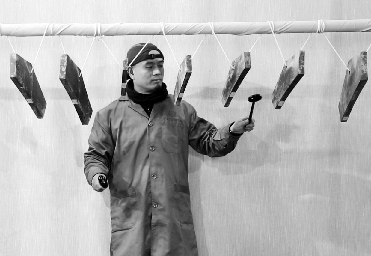 音乐考古专家使用澄城刘家洼1号墓编磬文物原件试奏《北京的金山上》