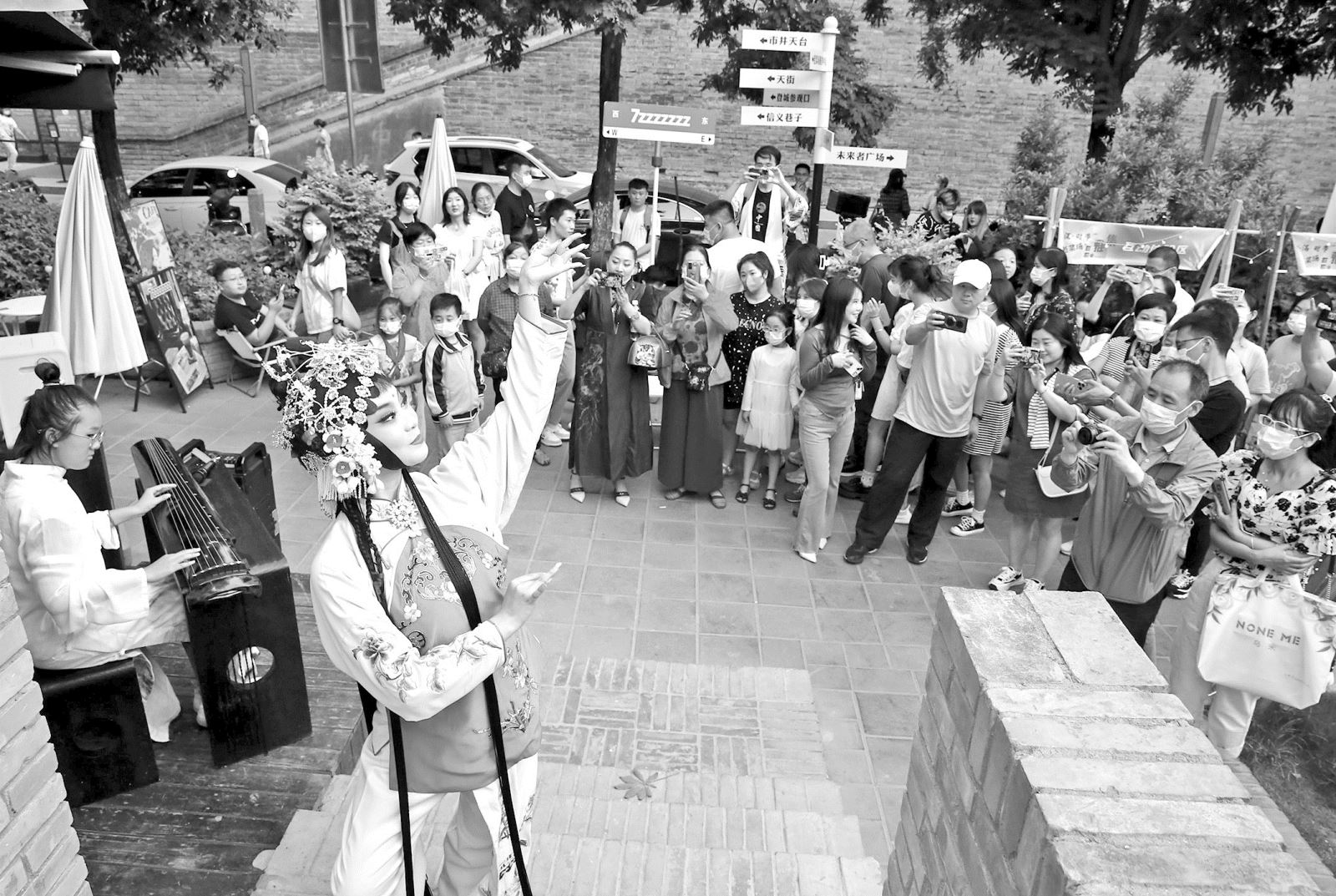 “非遗·雅集”集宣传展示、产品销售于一体,每次会设定不同的主题,邀请不同项目的传承人来到现场,与游客互动。不久前,活动邀请到碑林非遗戏曲容妆传承人党莉莉和戏曲盔帽制作箱倌技艺传承人霍耀武,带来了精彩的戏曲表演,让游客从演唱、盔帽、戏服、妆容等方面近距离感受到戏曲文化的精深。活动现场异常热闹,精湛的技艺和非遗之美,让游客们感到不虚此行。