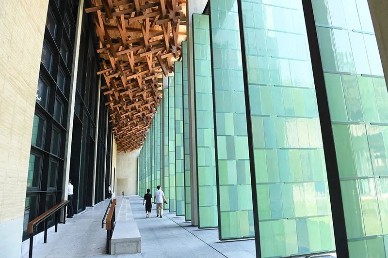 杭州分馆屋顶的木构和青瓷门扇相映成趣