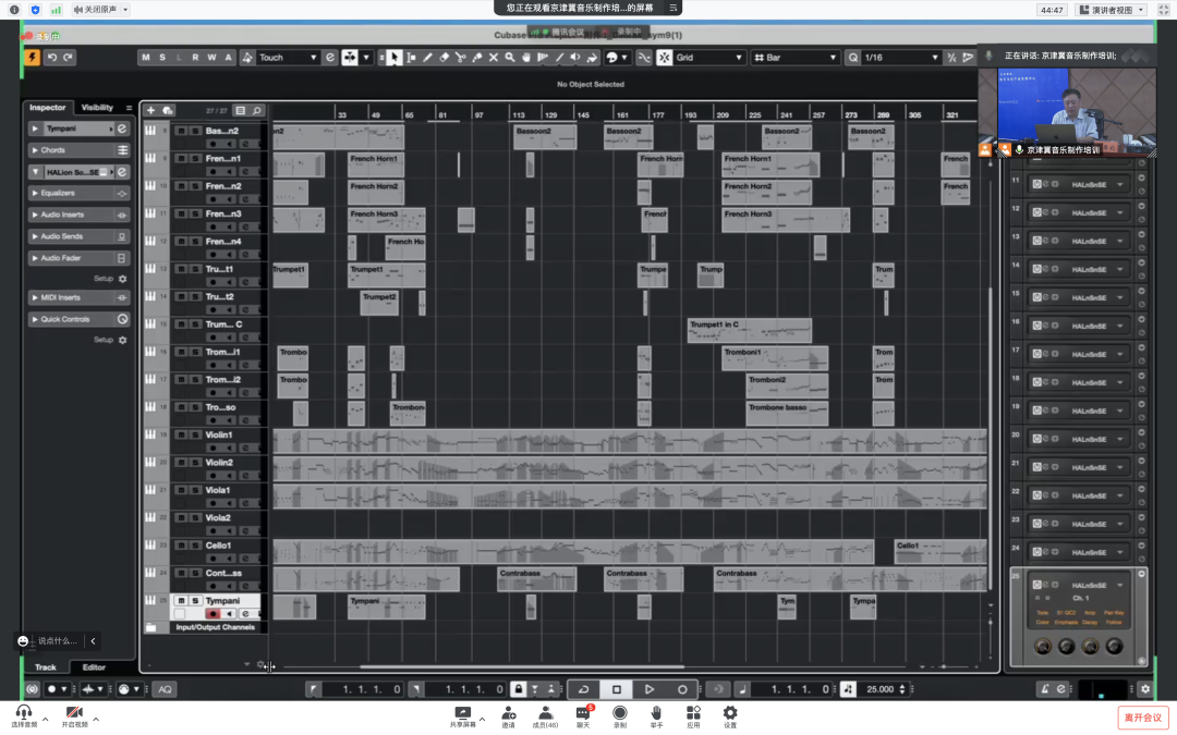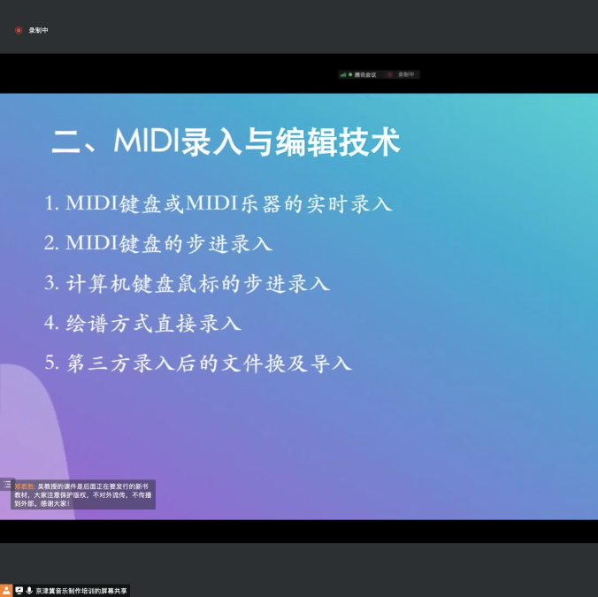 在本次的授课中,吴教授考虑到学员的构成有一定的特殊性,课程设计做了一定的兼顾策略,帮助不同层面的学员们均能获益和得到更广面的知识。吴教授先从概念与基础入手,讲解到:音乐制作是指在主题旋律的基础上进行作品的完形创意,并运用作曲技术、数字演奏技术及录音混音技术将音乐作品的音响作完整呈现。音乐制作课程以讲授MIDI录入与编辑技术为核心,以作曲技术和录音混音技术为两翼,定位于艺术与科技交汇的坐标之上,培养学生的艺术创意与技术的执行能力。吴教授对音乐制作技术的内核表述通俗易懂,非常到位,学员们很容易就能理解其深刻内涵。紧接着,吴教授为大家重温了MIDI录入与编辑技术的基础操作,这些都是音乐制作技术的基础,只有掌握了这些基础,才有可能更好地掌握更高级的音乐制作技术。