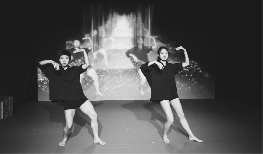 北京新剧元文化科技有限责任公司打造的AR互动舞蹈《平行》采用双人舞的表演形式,结合了音画联觉与AR特效。作品中,两位舞者根据现场音乐进行即兴表演,表演时长约为3分钟。投射的影像根据现场采集的效果进行AR处理,特效效果依据音乐旋律与舞者运动而产生变化,在观看两位舞者精彩舞蹈的同时,还可以看到屏幕中由摄像机进行实时传输的、融合了增强现实效果的现场画面,使得作品内涵更加丰富。