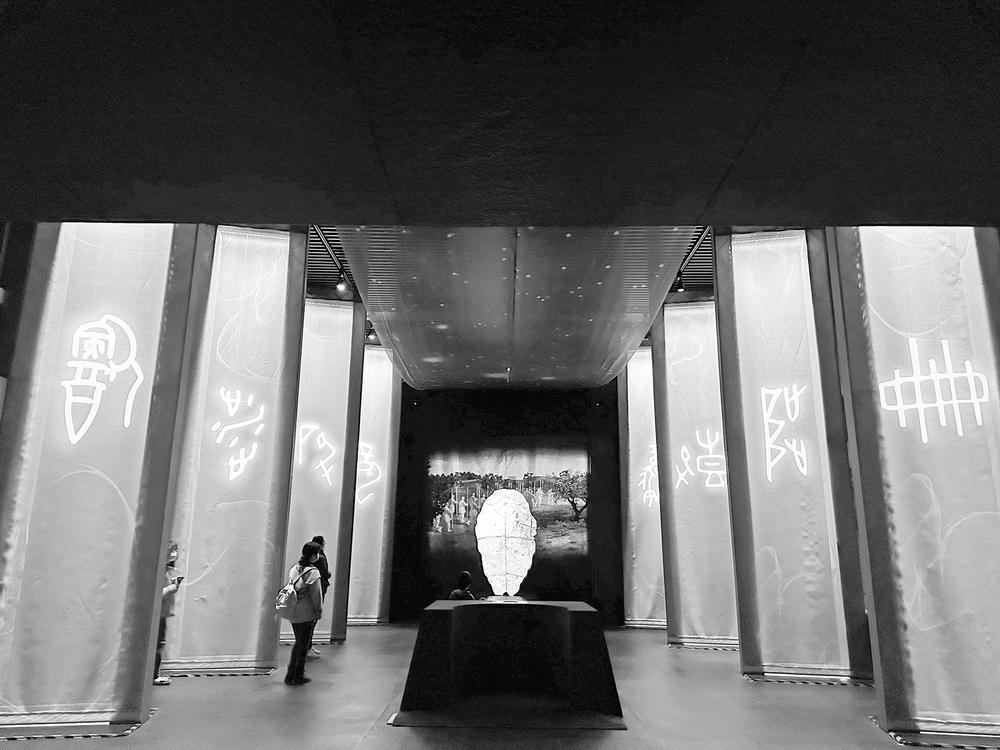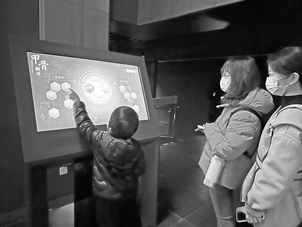 “近代以前,中国已知最古老的文字记录在青铜器上,后人称这种文字为金文。再向前,历史便没有了文字的踪迹。甲骨文是一种失传已久的古老文字,在漫长的3000年时光里,人们根本不知道它的存在。直到1899年,甲骨文才跨越时空,重现于世人眼前。”在“殷墟甲骨”专题的“神秘的文字”单元,一位父亲很认真地把文字说明读给儿子听。