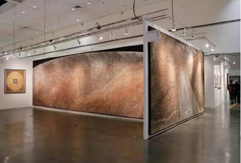 中央美术学院教授张国龙创作的巨幅绘画作品《长城》长10米、高2.8米,以油画创作为基础,辅以泥土、石块等大量综合材料,将西方表现主义艺术和中国写意绘画的美学意境相结合,具有很强的视觉冲击力,是艺博会近年来画幅最大的美术作品之一。