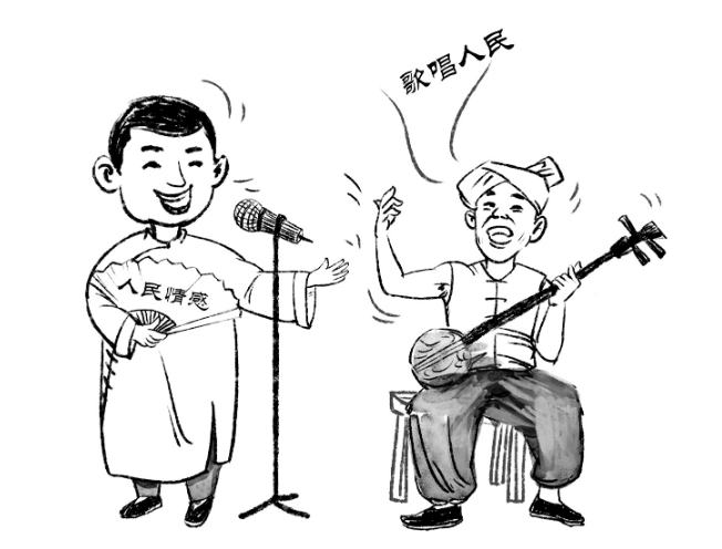 曲艺所拥有的特殊持久的艺术魅力,主要源自它与基层百姓和社会生活的紧密联系,同时,丰富的人文气息与精神内涵,亦是优秀曲艺作品不可或缺的重要成分。火热的现实生活,多元的审美需求,呼唤着曲艺人不断创作更多符合时代特征、体现时代精神的精品力作。只有始终与人民息息相通、心心相印,始终与人民同心、与时代同行,古老而又年轻的曲艺艺术才会永远与老百姓心连心。(蒋慧明)