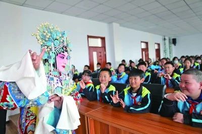 河北承德市戏剧协会的演员在为小学生进行传统戏曲表演。刘环宇摄/光明图片