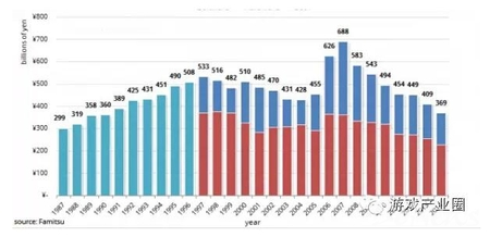 2014年日本游戏总收入达到了3690亿日元(约合208.8亿人民币), 其中包括1421.5亿日元的硬件销量和2264亿的游戏软件,总计较去年下降了10%,还创造了一项不光彩的记录:成为了自从1990年(360亿日元)以来游戏销售最差的一年。