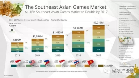 根据市场研究公司 Newzoo 统计的数据,身处印度尼西亚、马来西亚、菲律宾、新加坡、泰国以及越南的消费者们2014年在游戏领域的消费达到了11亿美元(约合68亿元)。这也就是说,到2017年时,东南亚地区的游戏年消费额将达到22亿美元。东南亚各国常住人口的数量超过了6.26亿人,但是能接触互联网的人只占到了29个百分点(即大约1.79亿人)。