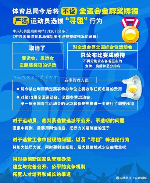 中央纪委监察部网站2015年1月26日发布《中共国家体育总局党组关于巡视整改情况的通报》。《通报》称,深刻认识金牌至上的政绩观扭曲体育精神的危害性。同时,体育总局取消了亚运会、奥运会贡献奖奖项的评选,对全运会等全国综合性运动会只公布比赛成绩榜,不再分别公布各省区市的金牌、奖牌和总分排名。