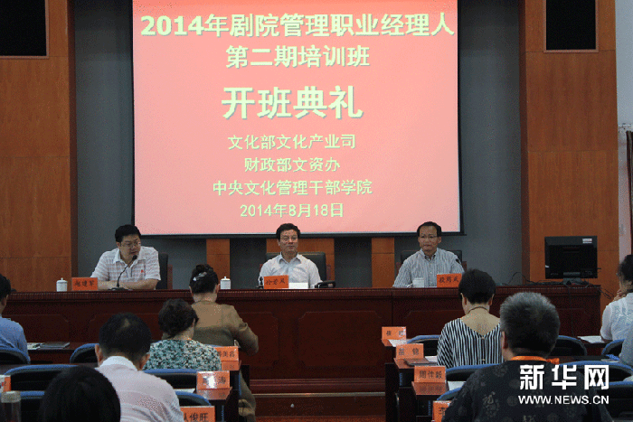 新华文化北京8月18日电为贯彻落实党的十八届三中全会提出的“建立职业经理人制度”的要求,培养一批具有国际视野的高素质剧院管理职业经理人,有效提升我国剧院的整体经营管理水平,由文化部文化产业司、财政部文资办统筹指导,中央文化管理干部学院具体组织实施的“剧院管理职业经理人培养项目”第二阶段培训,在中央文化管理干部学院开班。