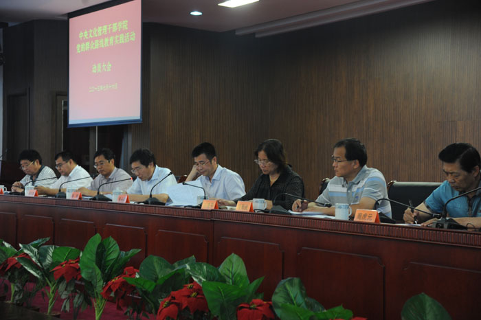7月16日下午,我院召开党的群众路线教育实践活动动员大会。张旭院长作动员部署,文化部第5督导组组长张永新同志作重要讲话。文化部第5督导组成员、学院领导班子成员和全体在职党员、离退休党员代表、群众代表参加了会议。会议由我院党委书记周庆富同志主持。