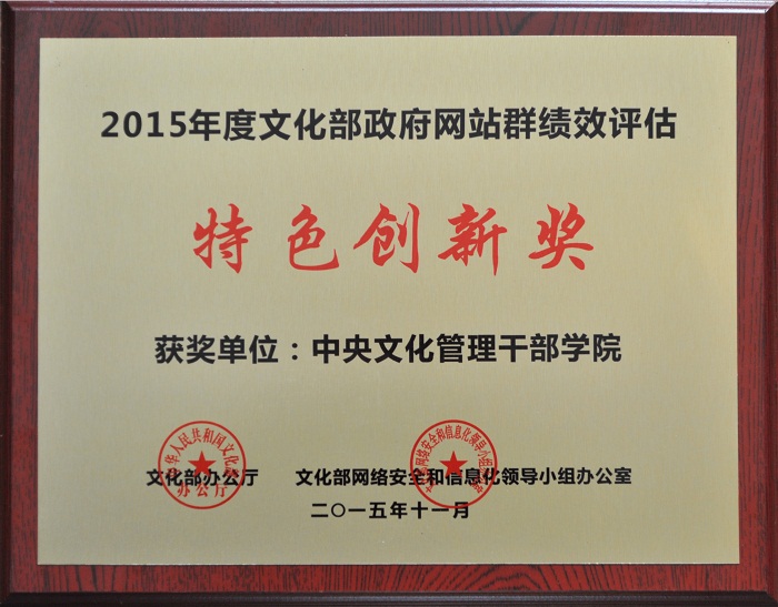 在第三方评估报告中指出,我院网站和国博、故宫等五家直属单位网站,十二五期间始终在文化部网站群中保持领先地位。文化部网站群推荐的我院官方网站特色创新项目是全国文化干部网络学院(文化干部学知网)。该项目是我院信息化建设的重点项目,是我院网站的有机组成部分。经过五年建设,全国文化干部网络学院已经初具规模,“具有行业网站示范作用,整合资源丰富,内容保障及时;业务应用效果显著”。文化部办公厅授予我院“特色创新奖”,是对我们的鼓励,我们当以此鼓励为动力,进一步丰富网络学院的课程内容,完善各项功能,积极拓展用户人群,争取为全国文化系统的全员培训做出更多贡献。