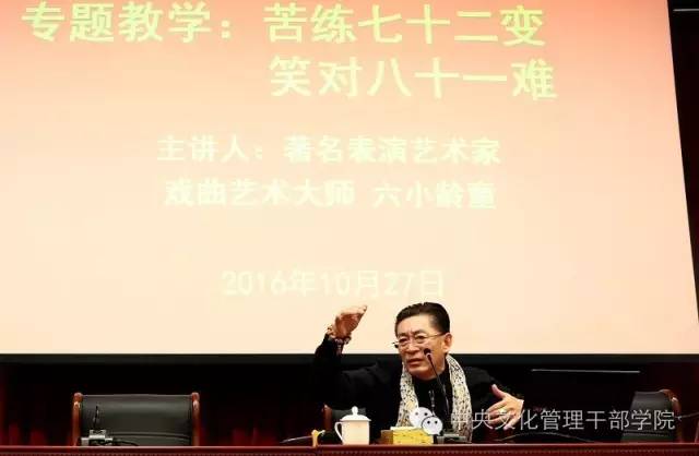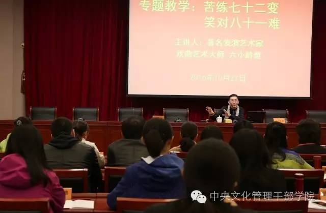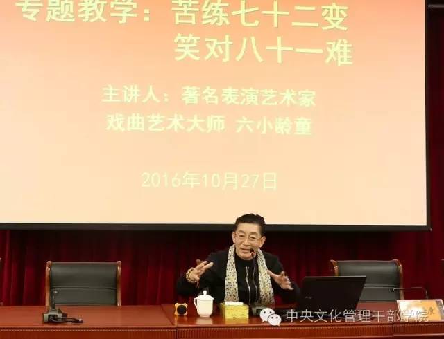 10月27日上午,著名表演艺术家六小龄童忍着母亲去世的悲痛走进我院“德艺讲堂”,为文化部第十一期文艺工作者培训班做《苦练七十二变,笑对八十一难》讲座,200多名文艺工作者参加了讲座。