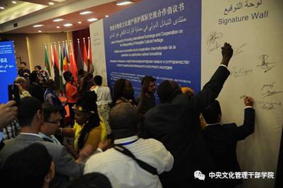 在 “我的非遗﹒我保护”活动单元。参会代表表示:在《保护非物质文化遗产公约》框架下,积极践行“一带一路”合作倡议,共同维护文化多样性,传承和保护人类共同的精神财富。最后代表们在倡议书上签名留念,论坛活动取得圆满成功。