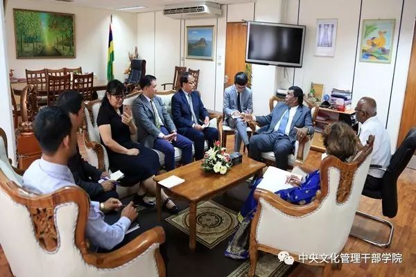 9月11至13日,代表团访问了毛里求斯。访毛期间,代表团一行在中国驻毛里求斯大使馆文化参赞、中国文化中心主任松雁群陪同下,拜访了毛里求斯艺术和文化部部长鲁蓬、常务秘书长拉基娜兰、文化局局长巴甘。双方就联手办训、互派师资、加强教硏合作等进行了积极蹉商。