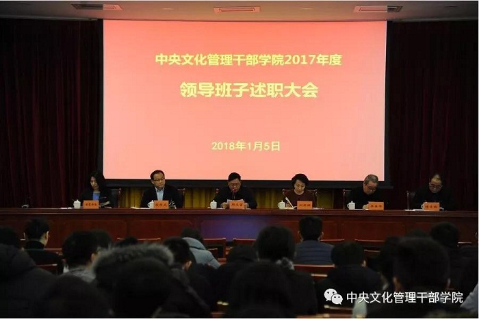 周庆富代表院领导班子作述职报告。2017年学院在党员教育和干部培训工作方面取得新的进展,全年完成培训班次271个,培训人次首次突破2万。学院进一步增强“四个意识”、牢固树立“四个自信”,始终将政治理论学习和党性教育放在第一位,全面加强党建工作;紧抓主体培训“牛鼻子”,实现文化干部培训广覆盖、多层次、远程化,干部培训事业蓬勃发展;科研咨询服务不断加强,智库建设持续推进;基础设施建设扎实推进,办训条件不断改善。2018年是全面贯彻落实习近平新时代中国特色社会主义思想和党的十九大精神的开局之年,学院将以"不忘初心、牢记使命"主题教育为重点,全面推进党的建设和各项培训工作。