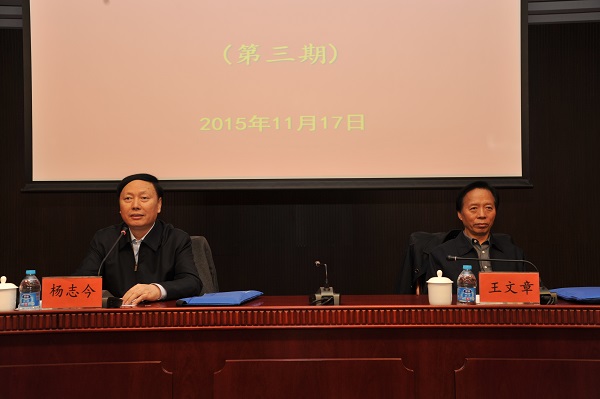 培训期间,文化部党组副书记、副部长杨志今和部党组成员项兆伦、王铁、董伟、丁伟,中国艺术研究院院长王文章、中国国家博物馆馆长吕章申等来到我院,参与学员交流研讨,畅谈学习体会,并对三期培训班进行总结。杨志今表示,通过此次学习,培训班学员们更加深刻地领会了十八届五中全会的精神实质,更加清醒地认识到文化部门肩负的责任使命,更加增强了推动文化改革发展的信心。为了推动学习贯彻全会精神的活动走向深入,要继续开展多种形式的学习活动,根据全会精神科学编制好文化发展规划和相关专项规划,将全会提出的发展理念贯彻落实到文化部门的各项业务工作中去。党员领导干部要发挥好模范带头作用,在加强学习上做表率,在加强履职上做表率,在改进作风上做表率。