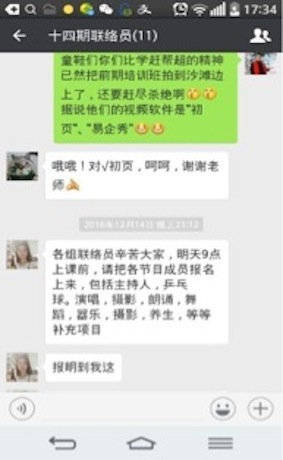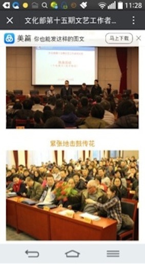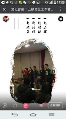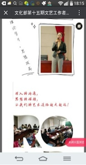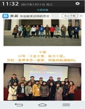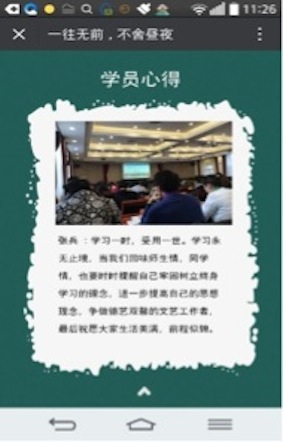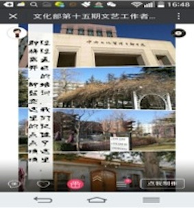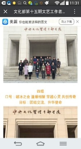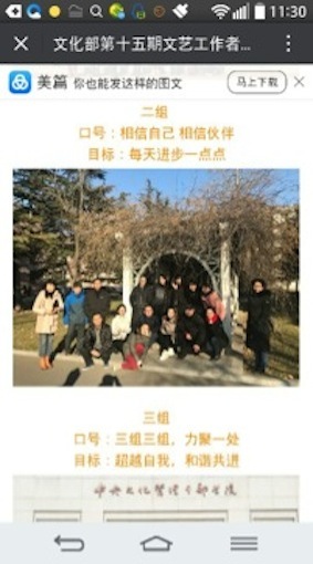 这是2016年12月22日文化部第十五期文艺工作者培训班211人结业日十个组竞相发布手机版学习简报壮观场景之一中的一个碎片截图,由此可见学员学习风貌之一斑……他们记述了200多名学员的可歌可泣的学习感人场景,也形象真实客观地记录下他们开心快乐的"大学生"一般的青春再现时光,再现了"抗大"学风"团结紧张,严肃活泼"。