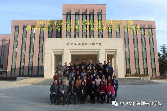 3月4日至9日,2017年全国文化干部素质能力提升工程—陕西省基层图书馆馆长及省馆业务骨干培训班在中央文化管理干部学院成功举办。来自陕西省图书馆及西安、宝鸡等10个地市、26个区县图书馆的50位图书馆人参加了学习。陕西省图书馆少儿部主任孙红侠、我院艺术教育部主任吴洪俊出席开班、结业仪式并讲话。