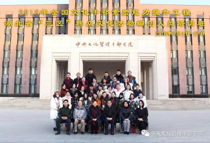 1月4日至1月27日,来自湖北省的33位学员在我院参加2018年全国文化干部素质能力提升工程——湖北省“三区”群众文化活动编创人员培训班的学习。我院党委书记、副院长段周武、湖北省文化厅党组成员、副厅长段天玲出席了开班仪式。