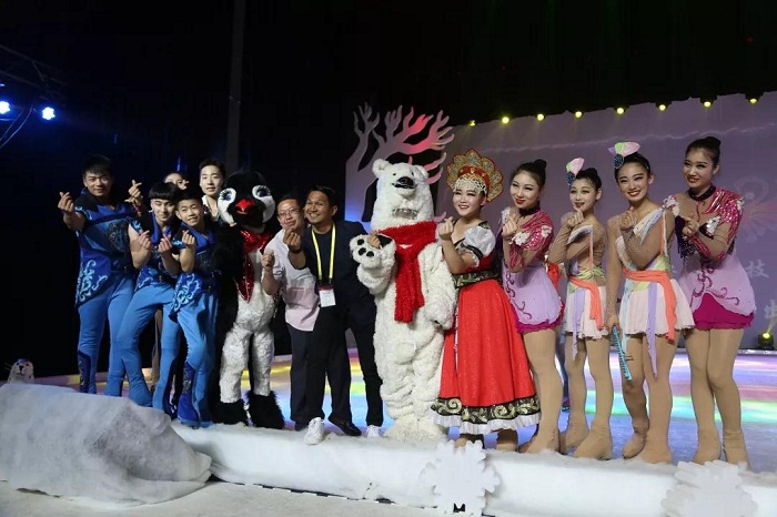 黑龙江省杂技团团长薛金升介绍冰上杂技文化并一同观看“冰秀”演出
