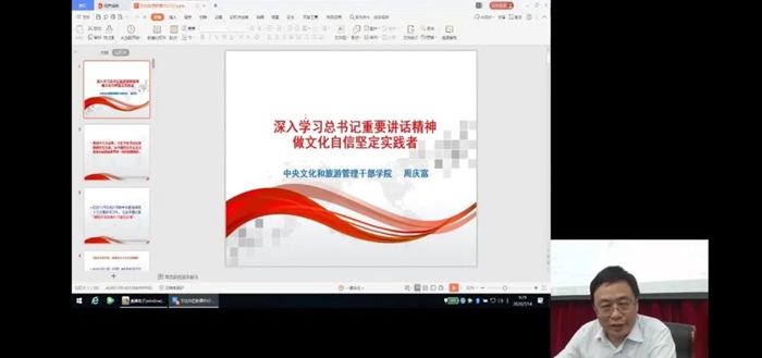本次培训班通过文化和旅游干部网络学院线上直播方式开展。培训班邀请到中央文化和旅游管理干部学院院长周庆富、上海社会科学院研究员巫志南,华东师范大学教授金武刚,浙江省文化馆研究馆员王全吉,中央文化和旅游管理干部学院研究员李蓁等专家线上授课。北京字节跳动公司政务合作副总经理贾临远,中国东方演艺集团国家一级编导李丽,中国戏剧文学学会驻会副会长羊驰结合创作实践讲授了如何用短视频直播助力文化宣传,群众舞蹈编创理念与技巧,小型戏剧的创作路径等专题课程。