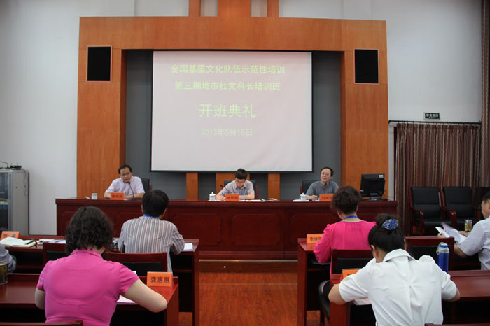 2013年5月15日至21日,全国基层文化队伍示范性培训第三期地市社文科长培训班在我院举办,这是全国基层文化队伍示范性培训地市级社文科长培训五年计划中的第三年,受到了各方领导的高度重视。在开班典礼上,中央文化管理干部学院副院长段周武致欢迎辞,文化部公共文化司副司长陈彬斌作开班动员,中央文化管理干部学院培训部主任刘瑞彪主持。
