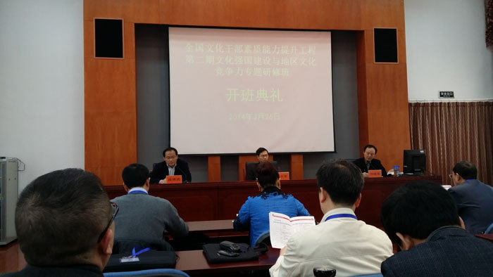 2014年3月25日至4月3日,全国文化干部素质能力提升工程第二期文化强国建设与地区文化竞争力专题研修班在我院举行。在开班典礼上,文化部人事司副司长张士军作开班动员讲话,中央文化管理干部学院副院长段周武致欢迎辞,中央文化管理干部学院培训部主任刘瑞彪主持。