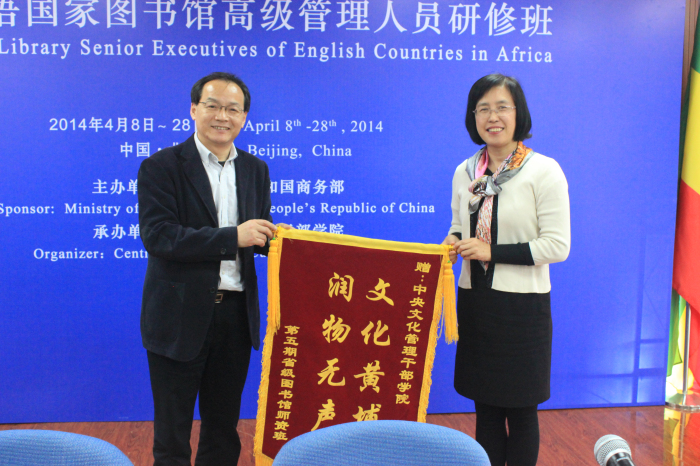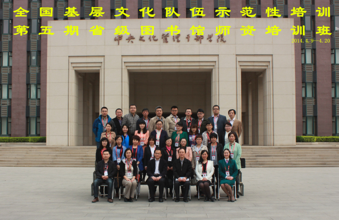 2014年4月9日至20日,全国基层文化队伍示范性培训第五期省级图书馆师资培训班在我院举行,这也是全国基层文化队伍示范性培训系列中的重要班次,受到了领导的高度重视。在开班典礼上,中央文化管理干部学院副院长段周武作开班致辞并做动员,希望学员们抓住这次难得的学习机会,学有所获,不虚此行;中央文化管理干部学院培训部主任刘瑞彪主持。