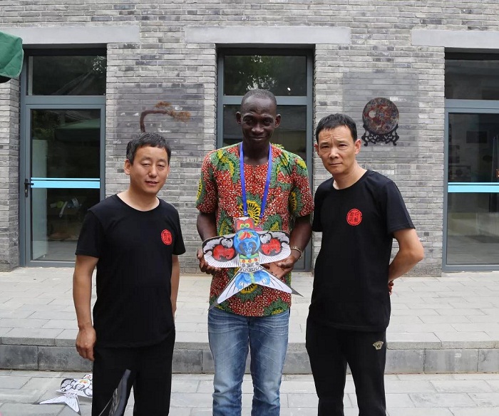 在风筝展台,学员们一边制作,一边与传承人探讨上色的笔触和颜色的选择。其中,一位来自几内亚的学员大胆地使用蓝色进行填充,得到了传承人的夸奖。