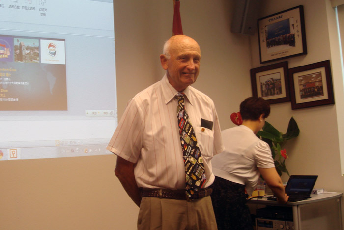 这时一位身着白衬衣,脖系领带的美国人,在工作人员的陪同下,迈着矫健的步伐步入会场。大家不约而同地注视着这位美国人,他身材细长,年龄大约在80岁左右,腰板挺直,精神气十足,他就是美中交流协会的主席赫伯先生,他是专程来看望大家的。他用不太流利的中文说了句:“你们好!欢迎!”,大家报以热烈的掌声。赫伯先生开始介绍了美中交流协会的发展和未来以及对中国文化的了解。接下来赫伯先生参加了旧金山美中交流协会为我们举办的欢迎晚宴,出席这次晚宴的还有专程赶来的中国驻旧金山总领馆文化处***参赞和夫人以及文化处的全体工作人员。大家对如此规格的接待十分高兴,宴席间大家纷纷表示,一定不虚此行,认真完成好此次培训任务,为我们的公共文化服务建设做出我们的贡献。