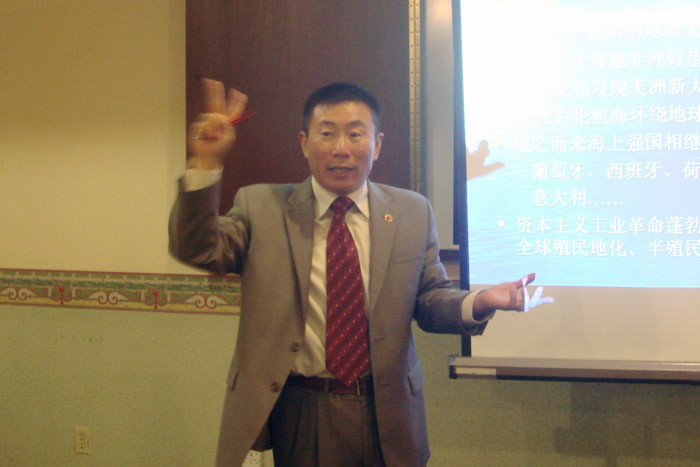 下午, 由美国旧金山美中交流协会副会长葛滨博士授课“跨文化视角:全球化新趋势 ——美国发展再认识之总体方法论”。